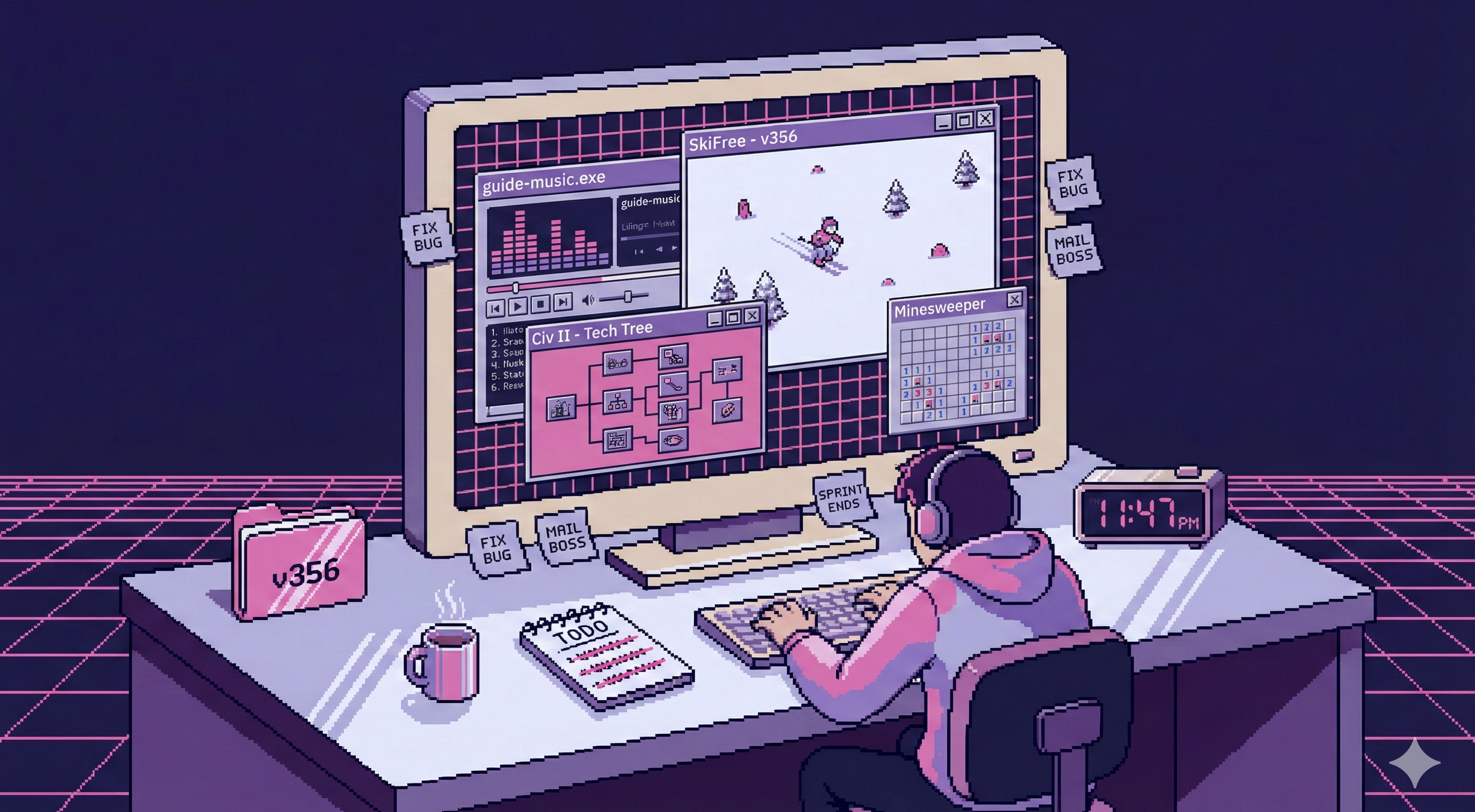 “1. lets go for 1… this is epic” is literally how the Minesweeper theme happened for the common mistakes chapter. The Civ tech tree started with “what about something out of Civilization 2 or 3?” The defragmenter came from asking how to make the codebase readiness checklist less boring. SkiFree was the only one I walked in knowing I wanted, because pressing F to outrun the yeti was the perfect metaphor for the chapter’s point.